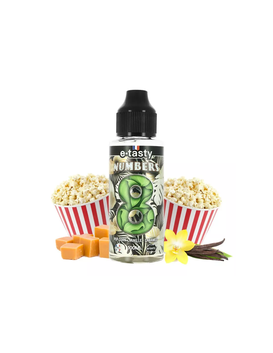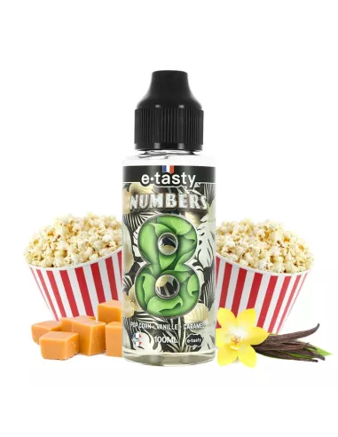 E-liquide gourmand NUMBERS 8 aux saveurs délicates de biscuit caramélisé et de crème onctueuse, disponible en flacon généreux de 100 ml pour une expérience de vape prolongée.